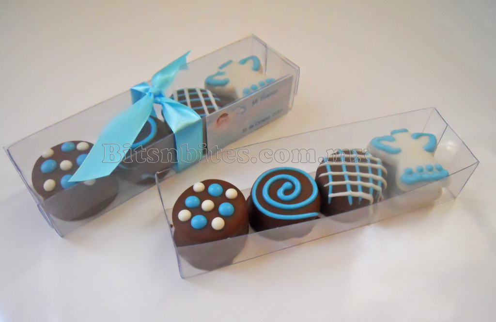 Estos alfajores fueron para un bautizo. La cajita lleva 4 alfajores redondos chicos y un alfajor en forma de angel chico.