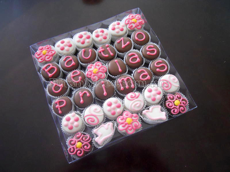 En esta cajita se combinaron varios tipos de afajores: Alfajores redondos chicos con mensaje, alfajores en forma de flor y alfajores en forma de palomita. Se puede hacer todo tipo de combinaciones y hacer una presentacion totalmente unica y original.